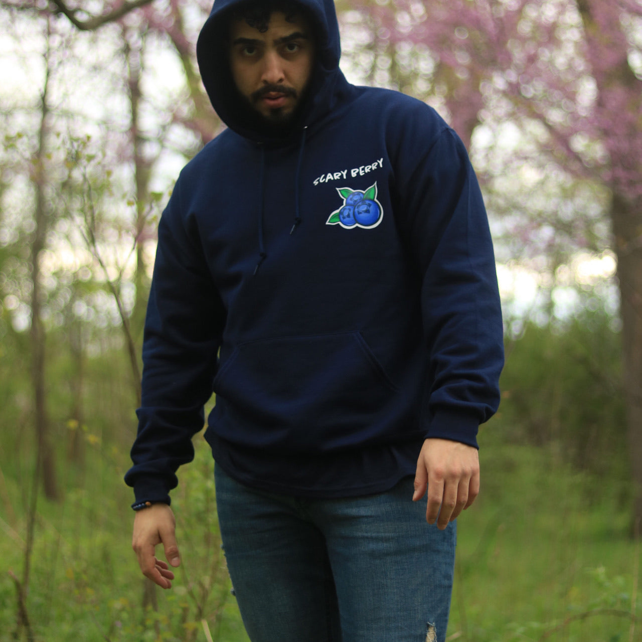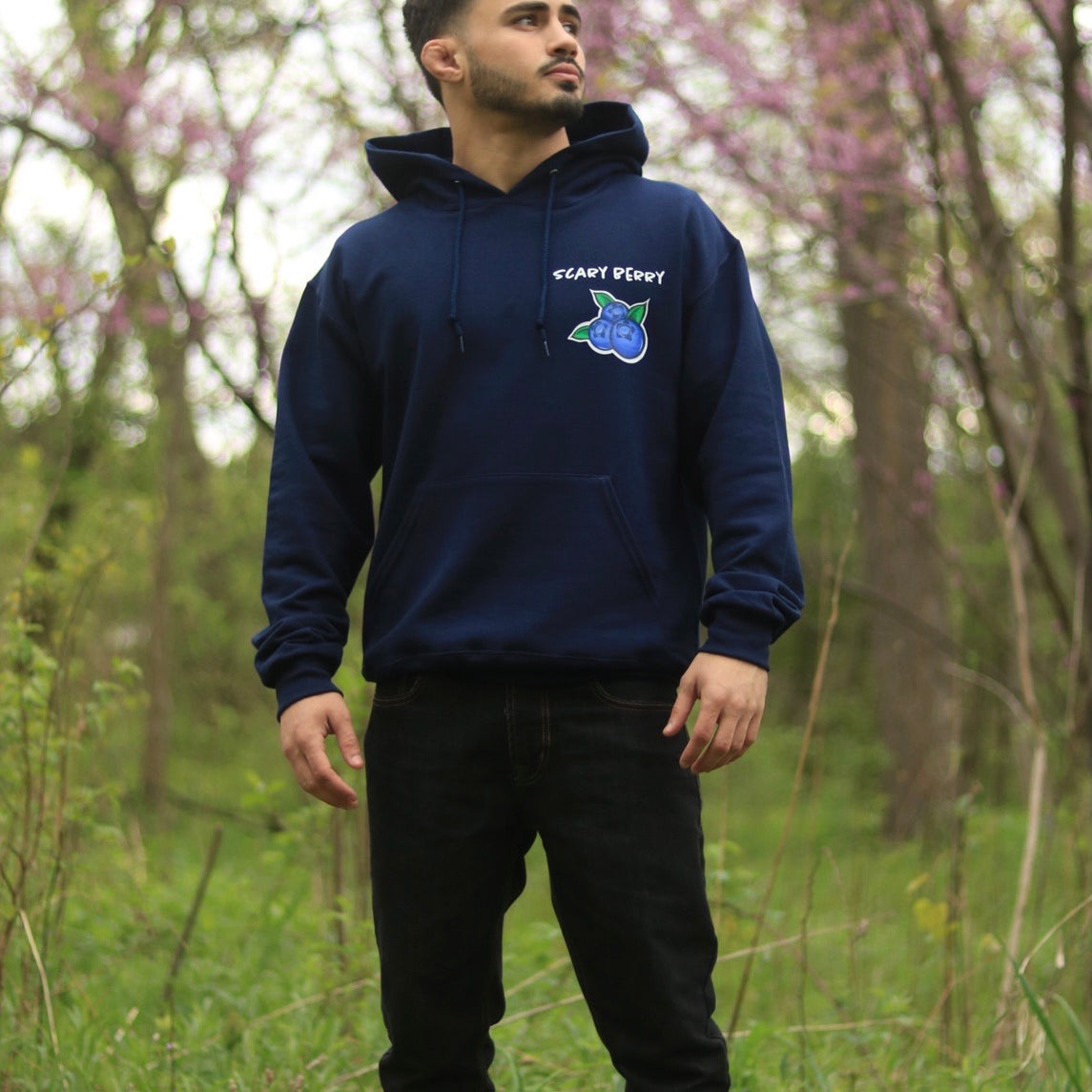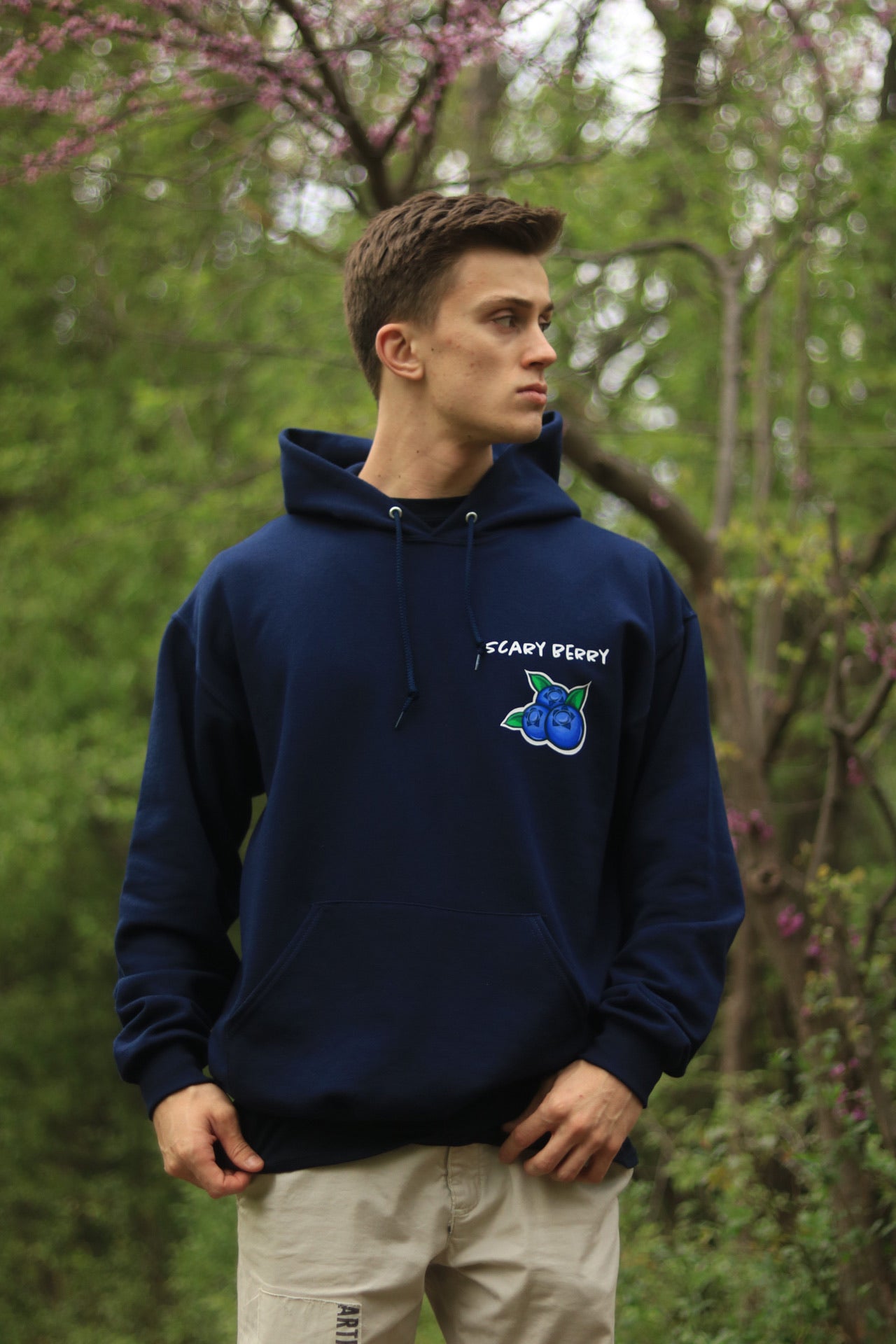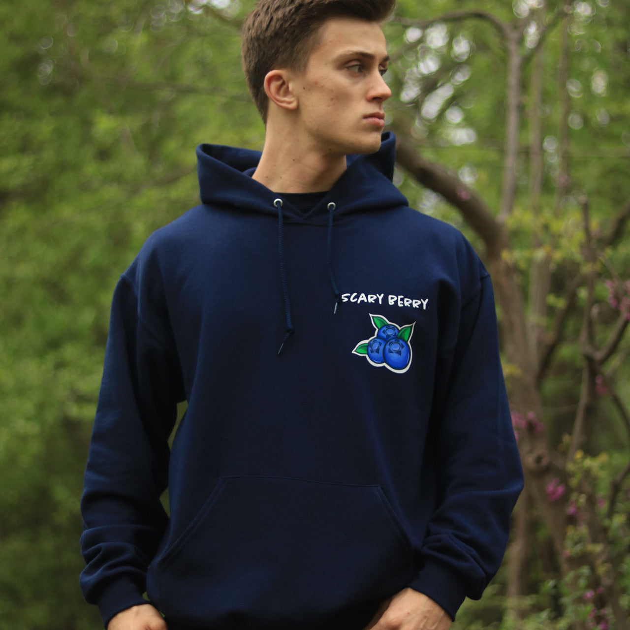 - Full color blueberry graphic on left chest, official merchandise stamp near back hem.