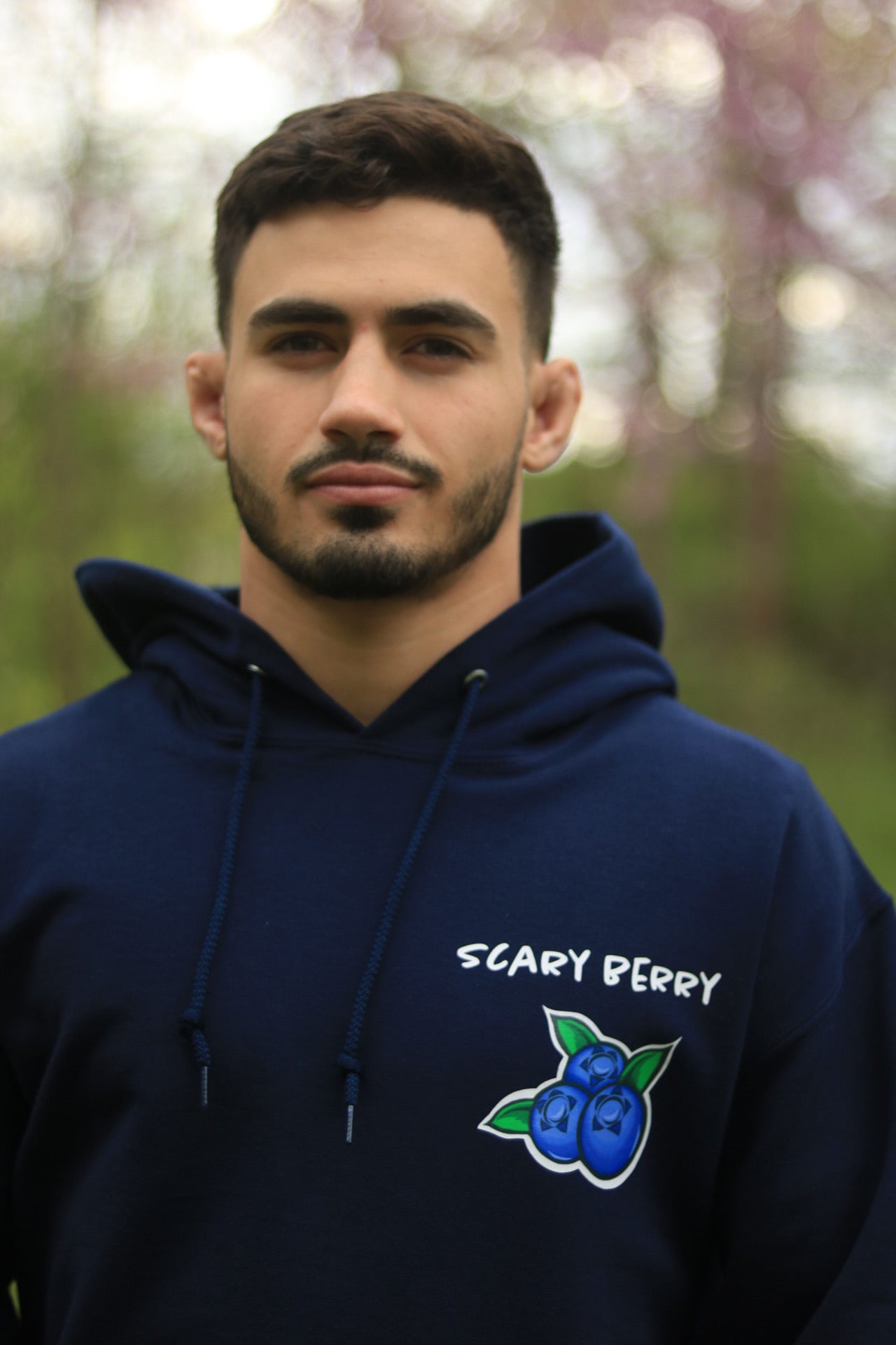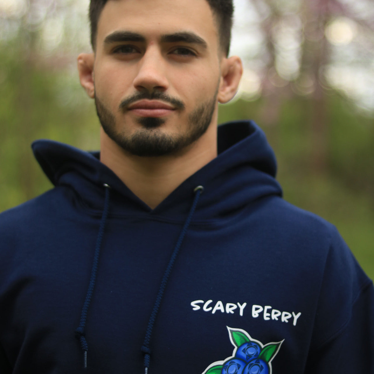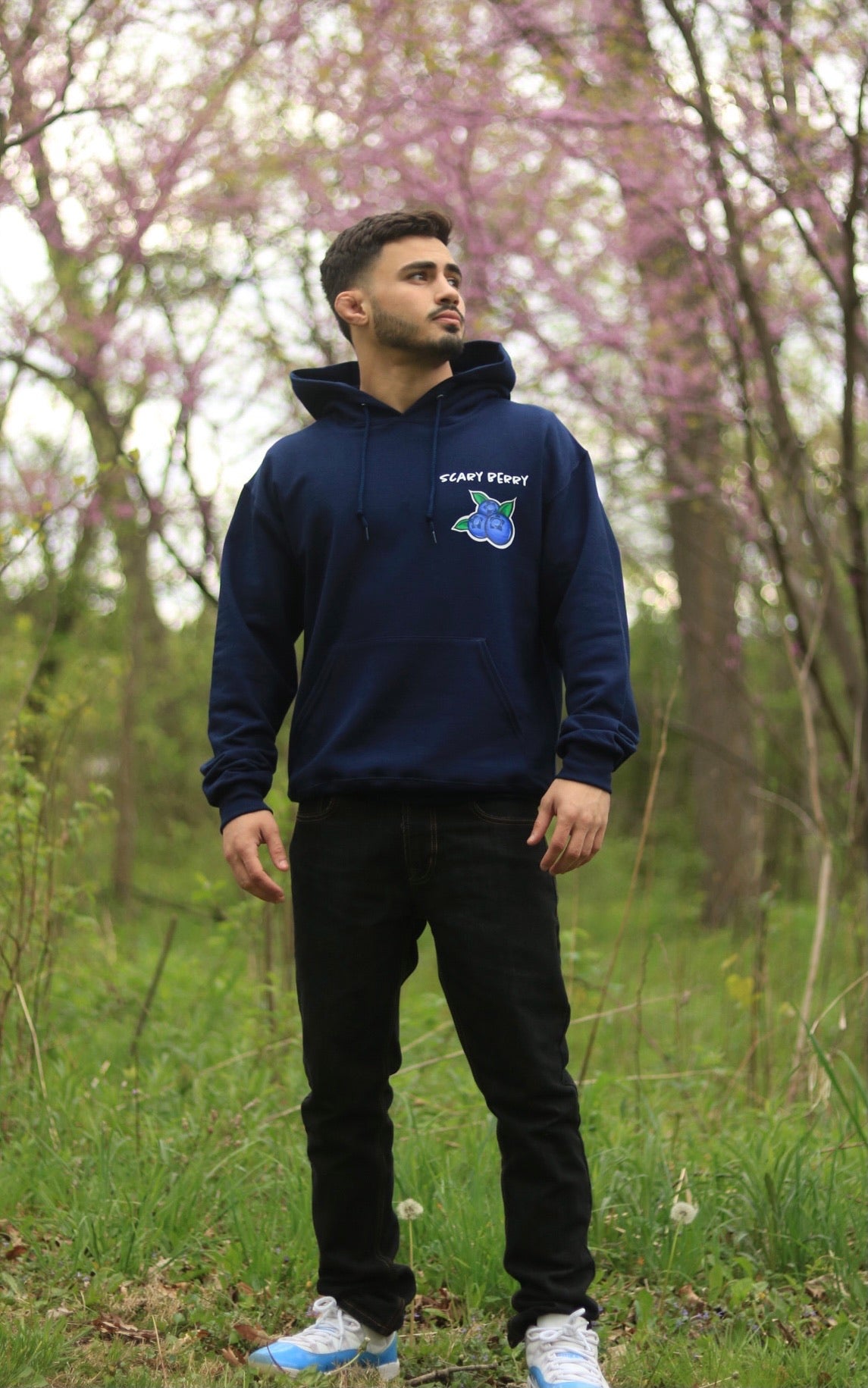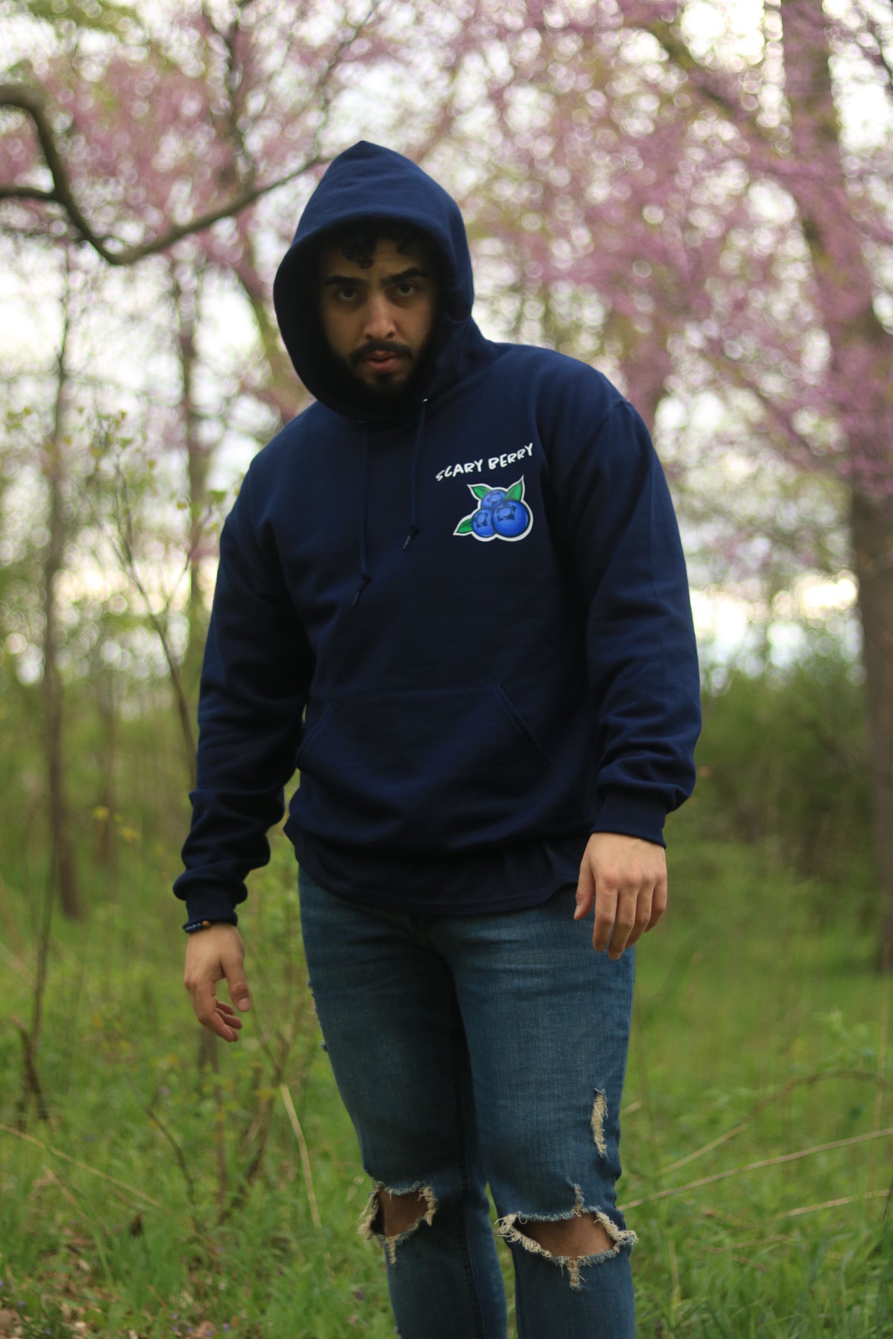 - Full color blueberry graphic on left chest, official merchandise stamp near back hem.