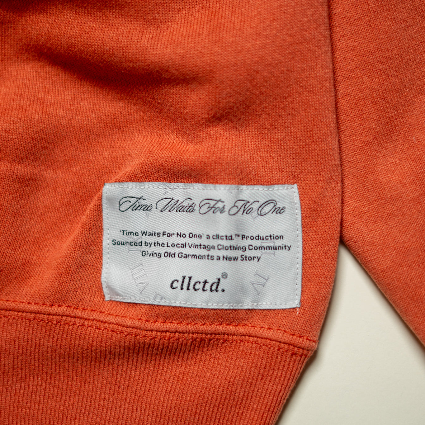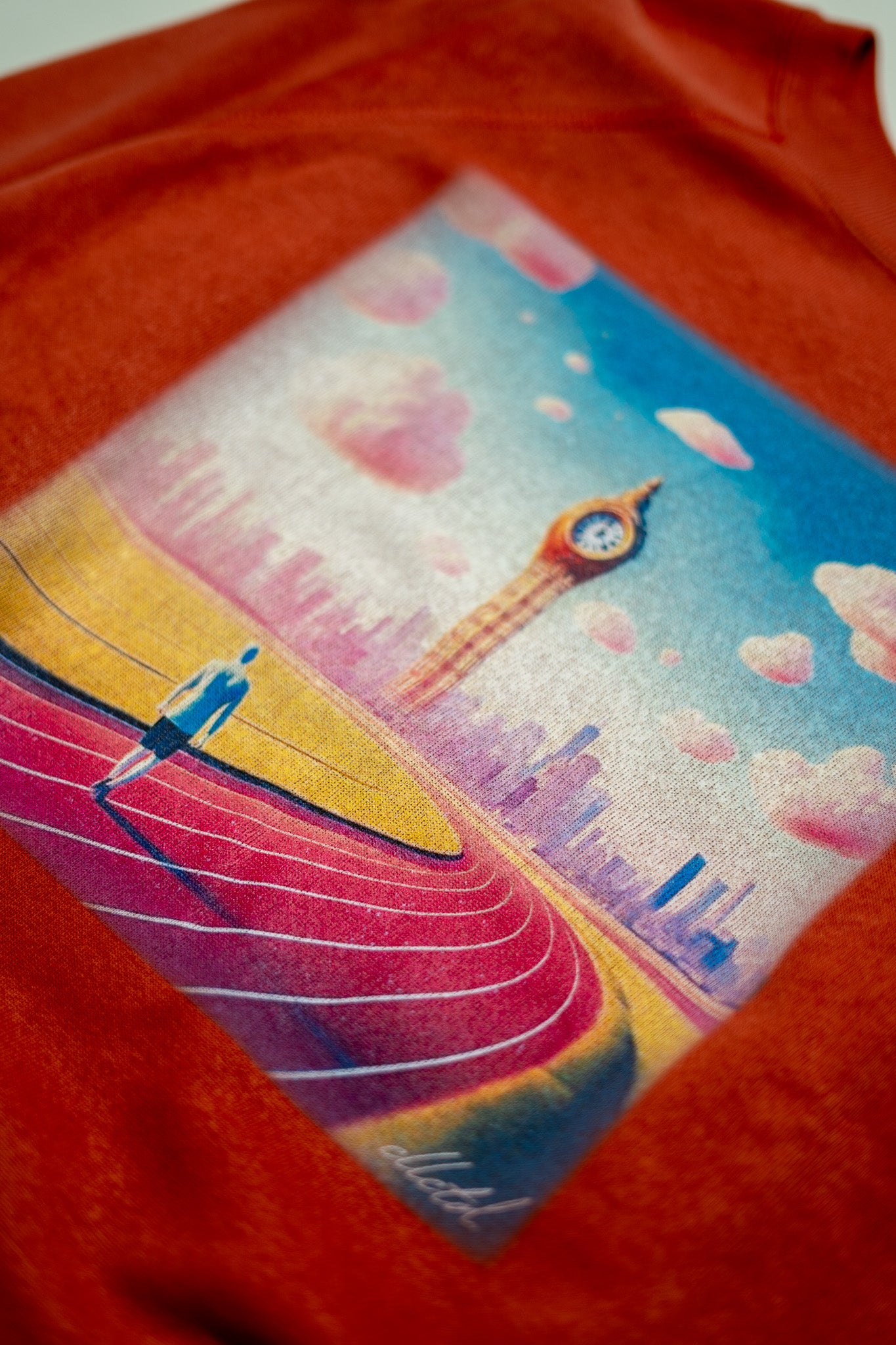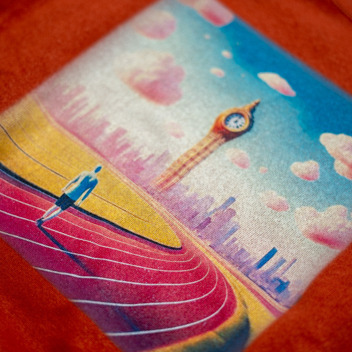 Original ‘Time Waits For No One’ artwork Direct To Garment Printed on the center-front of the garment