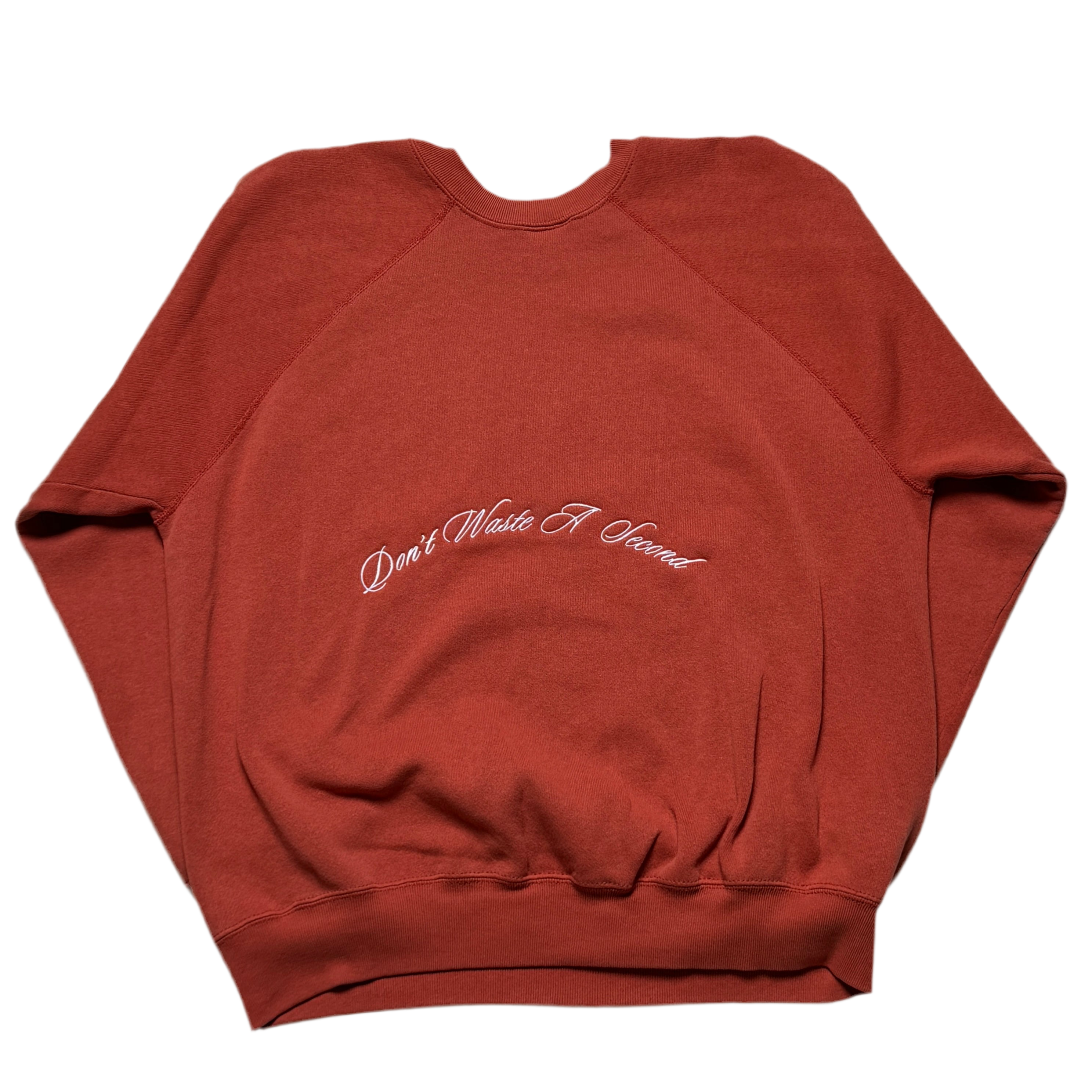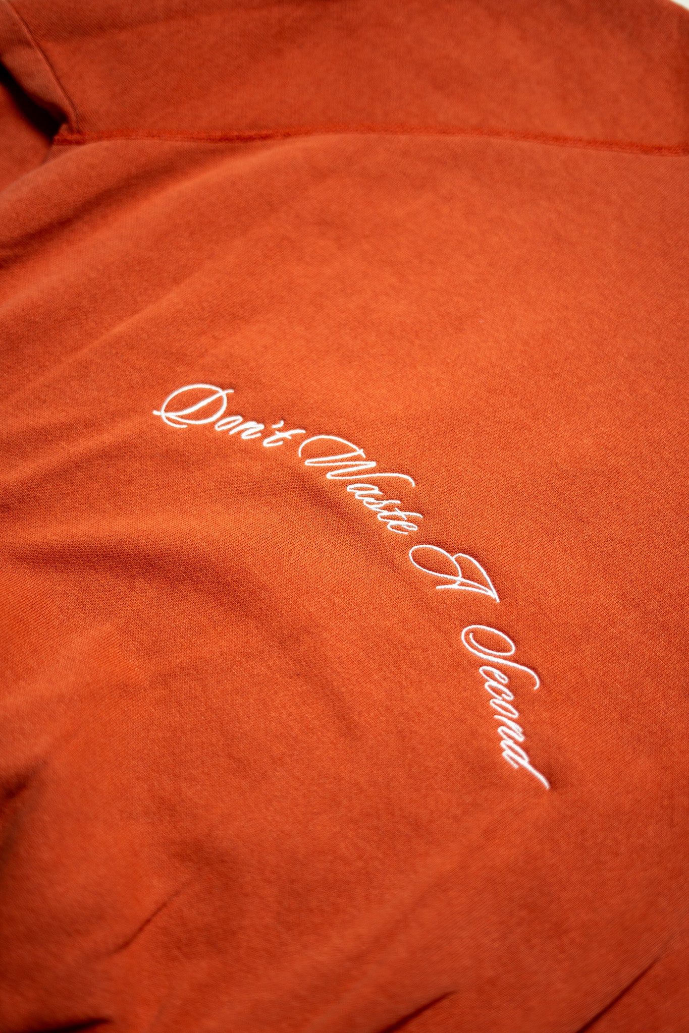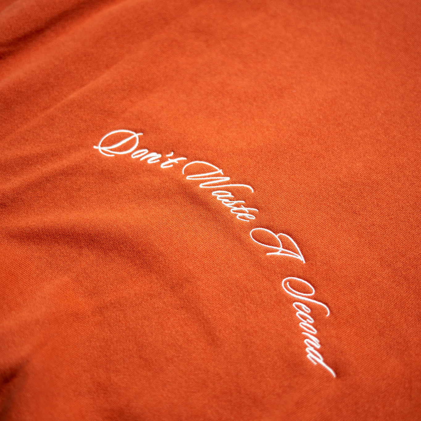 ‘Don’t Waste A Second’ embroidered to the mid-center back.