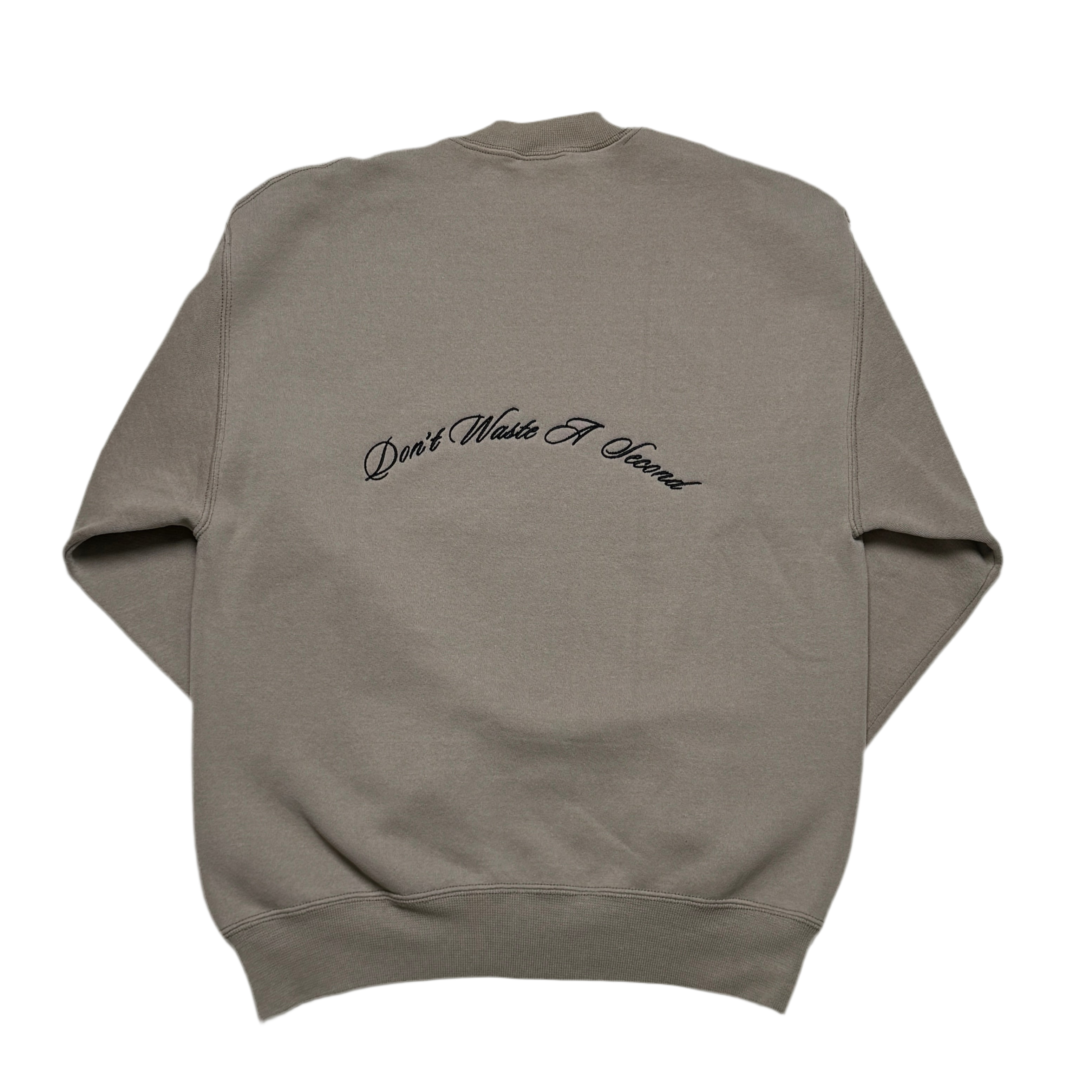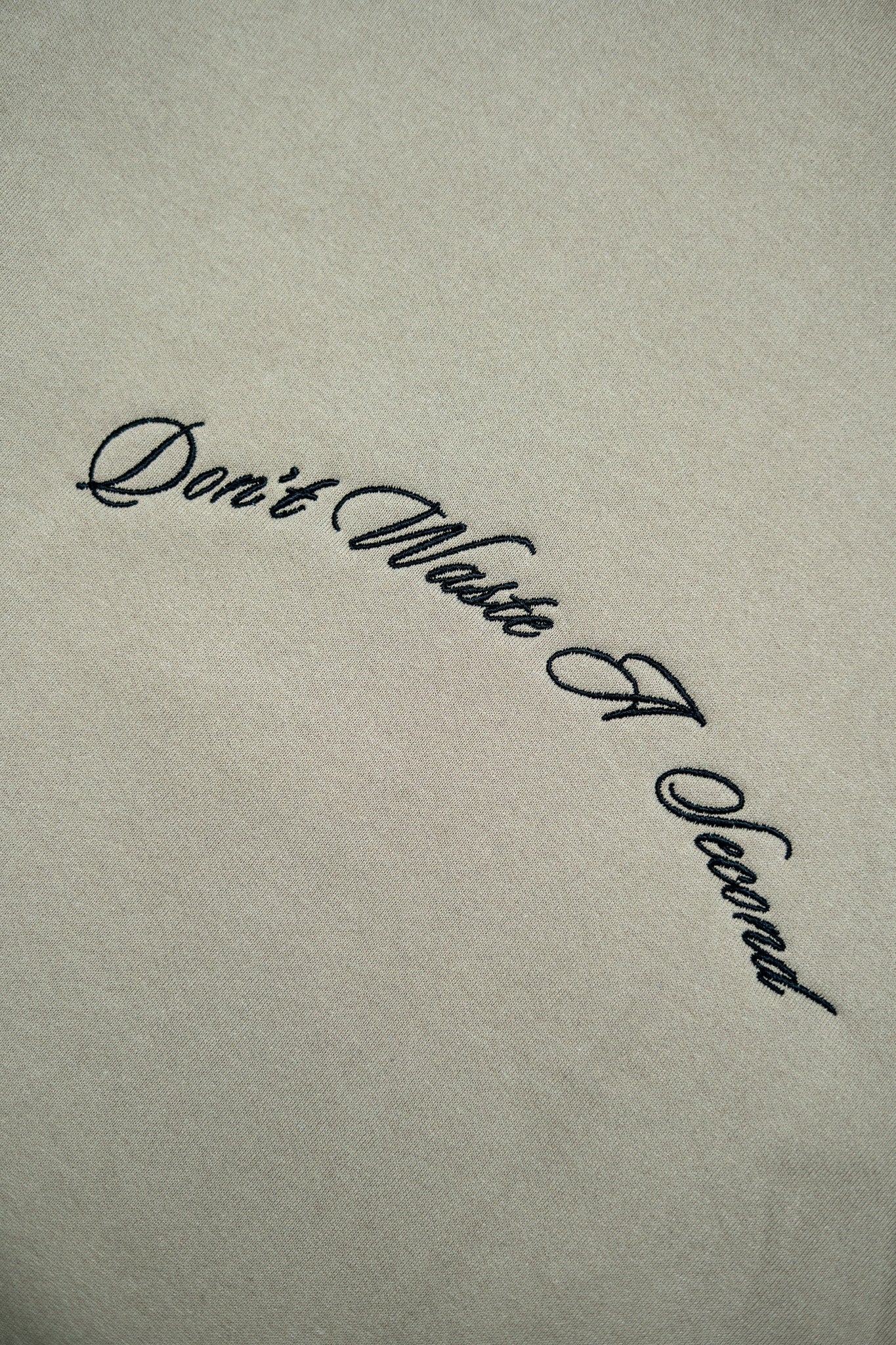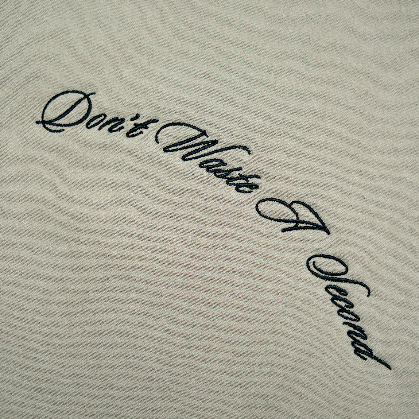 ‘Don’t Waste A Second’ embroidered to the mid-center back in black thread.