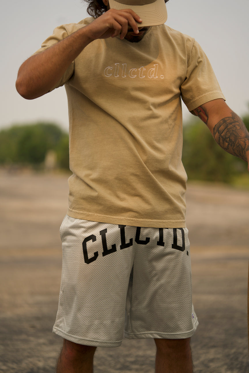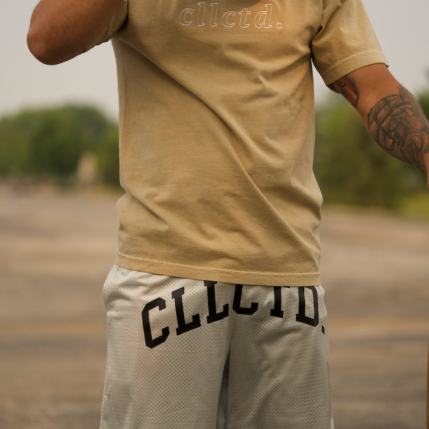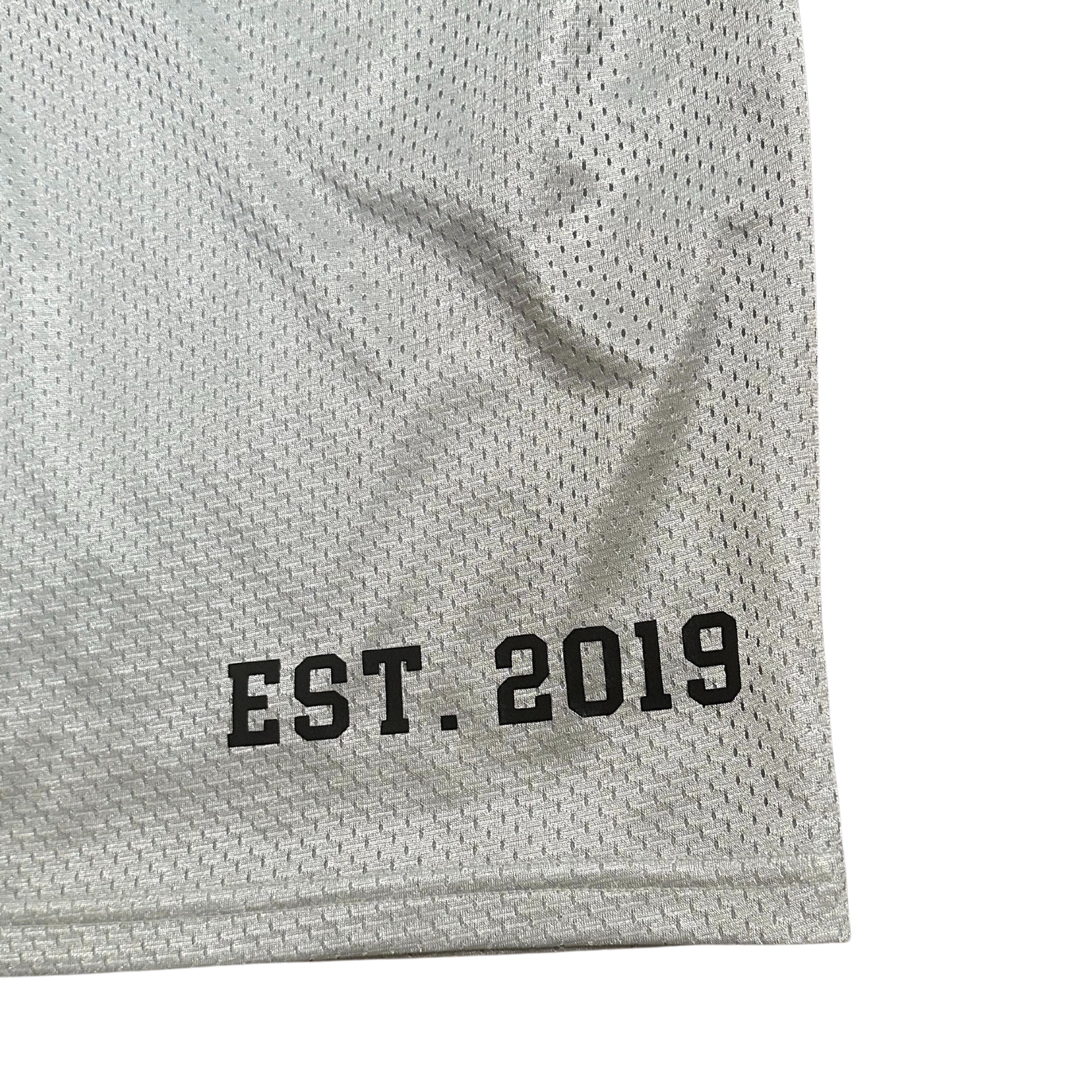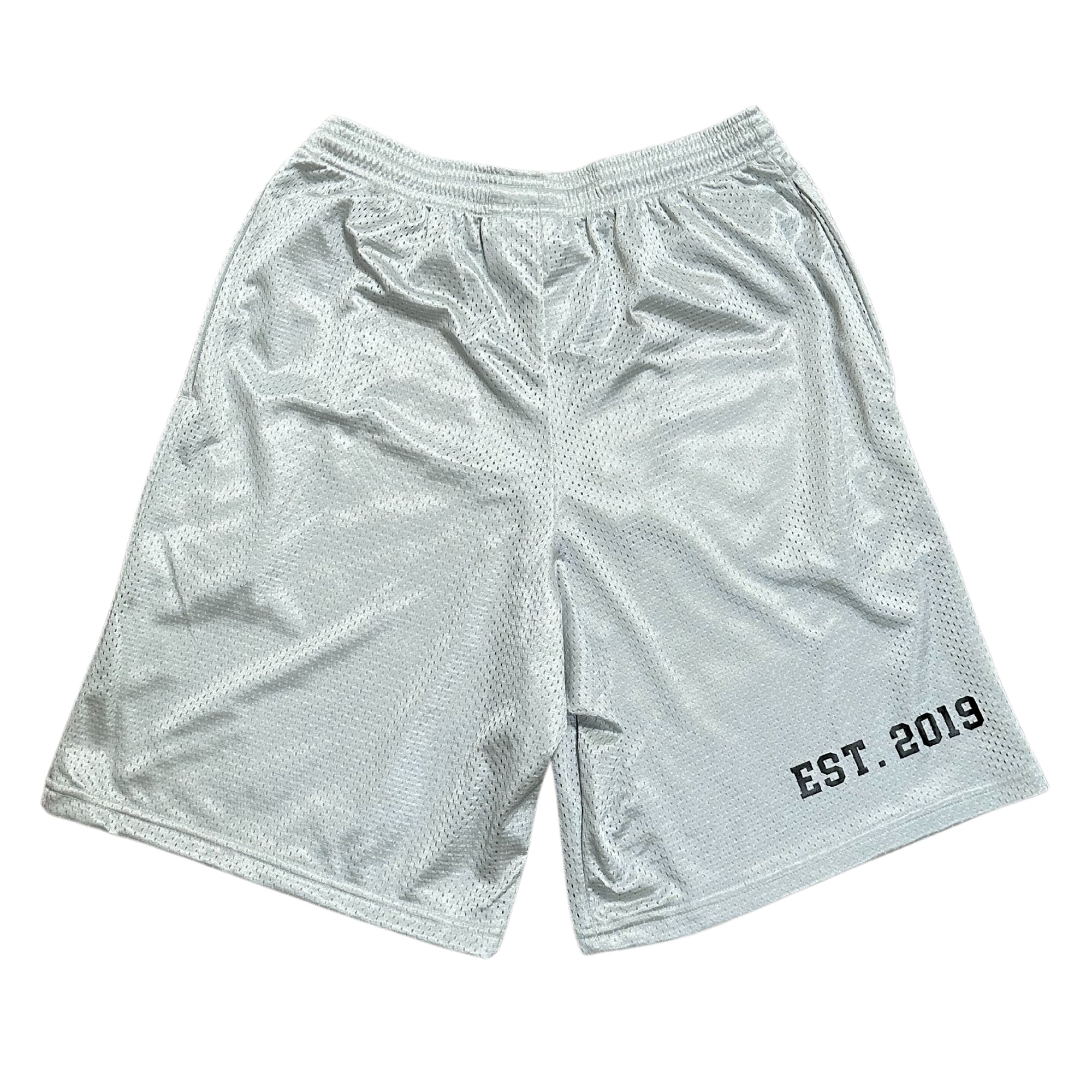 - Silver grey mesh shorts featuring a 14in cllctd. college logo across the front